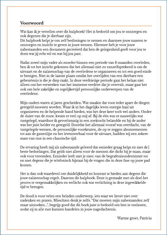Met praktische invulruimte en inspirerende vragen biedt het een gestructureerde manier om herinneringen, keuzes en regelingen op papier te zetten.